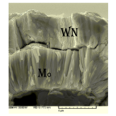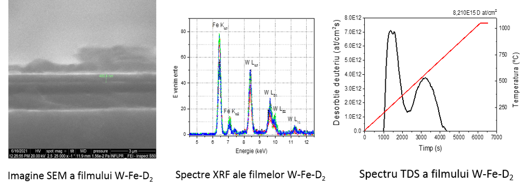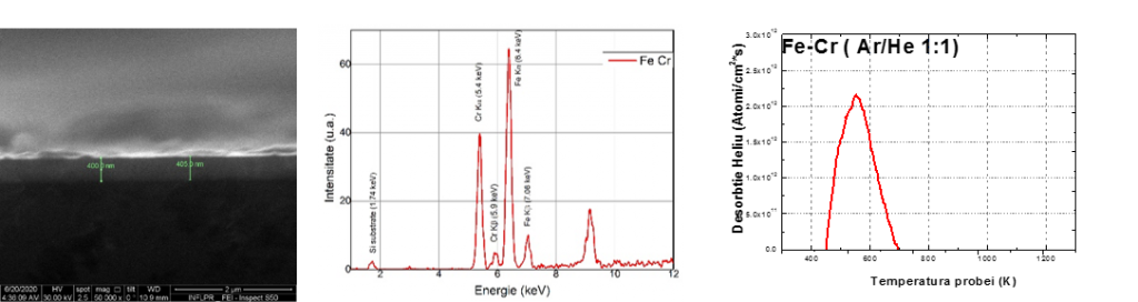 Această faza studiază morfologia, structura cristalină, proprietățile mecanice, retenția și desorbția He din structuri de dimensiuni nanometrice (500nm) de tip W/Cr și W/Cr. Pentru realizarea acestor tipuri de materiale s-au folosit două tehnici de pulverizare magnetron în regim continuu cât și prin utilizarea unui regim hibrid unde catodul prevăzut cu ținta de W a fost operat în regim HiPIMS. Astfel, au fost obținute 12 seturi de probe prin varierea fluxului de He utilizat în timpul depunerii, 5 sccm respectiv 10 sccm, dar și a temperaturii aplicate pe substrat (Temperatura camerei și 437 K). Investigațiile morfologice realizate cu ajutorul SEM pe substrat de W au arătat o morfologie ce urmărește linia substratului atât pentru straturile de W/Cr și W/Fe. Natura cristalină a filmelor de tip W/Cr a fost evidențiată prin XRD de prezența unei faze cristaline intermetalice stoichiometrice Cr0.5W0.5. Gradul de cristalinitate al acestor straturi subțiri este dependent de fluxul de He și de tehnica de depunere și independent de temperatura de lucru. Proprietățile mecanice s-au investigat cu ajutorul nano-indentării. Modulul de elasticitate și duritatea filmelor de tip W/Cr, respectiv Fe-Cr este puternic influențat de temperatura substraturilor în timpul depunerii. Retenția de He și comportamentul de eliberare al acestui gaz din straturile de tip W/Cr și W/Fe a fost studiată prin măsurători TDS.