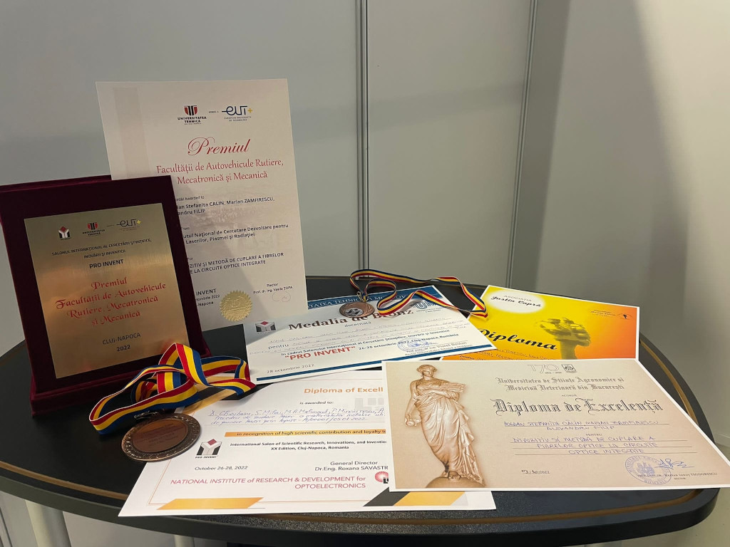 Brevet: Dispozitiv și metodă de cuplare a fibrelor optice la circuite optice integrate. Premiat de Facultatea de Autovehicule Rutiere, Mecatronică și Mecanică.